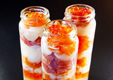 弥生の無添加いくら醤油漬けはもちろん、中トロ、ズワイガニ、ほたて、いか、サーモン、とびっこなど7種類の厳選素材を使用したオリジナルの海鮮瓶です。